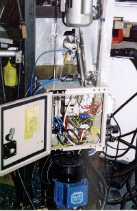 Rear view (showing control box,motors,etc.)of purpose made electrically powered,pneumatically operated,automatic drilling,de-burring,reaming and spot-facing machine designed and built in-house.