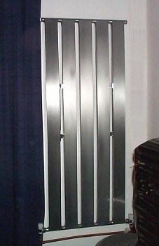 This is a new venture for us,brought about when one of our staff had a window in their lounge replaced by a patio door and had to remove the radiator that had been under the window.A vertical radiator was needed and since we have cutting, machining,welding and polishing facilities,we decided to make one in aluminium.The result is shown below.The original idea was to have it anodised blue but once it had been satin finished it looked nice enough to leave natural aluminium.However,as we have had many years experience in using coloured anodised finishes,we will be exploring their use on radiators as we believe they could be quite striking.We will also be looking at using stainless steel in polished and satin finishes.